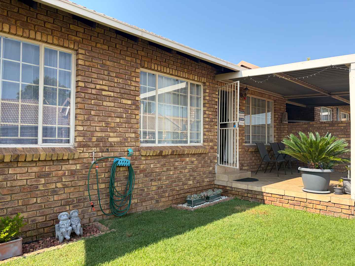 Outdoor living is enhanced with a charming covered patio and lovely garden, perfect for enjoying sunny days or cultivating your favorite plants. The single garage not only provides secure parking but also features a door leading directly to the back garden, adding convenience and ease of access. Additionally, a single carport offers extra parking space for guests or a second vehicle. There is also 24 hours manned security and two parks in the estate.