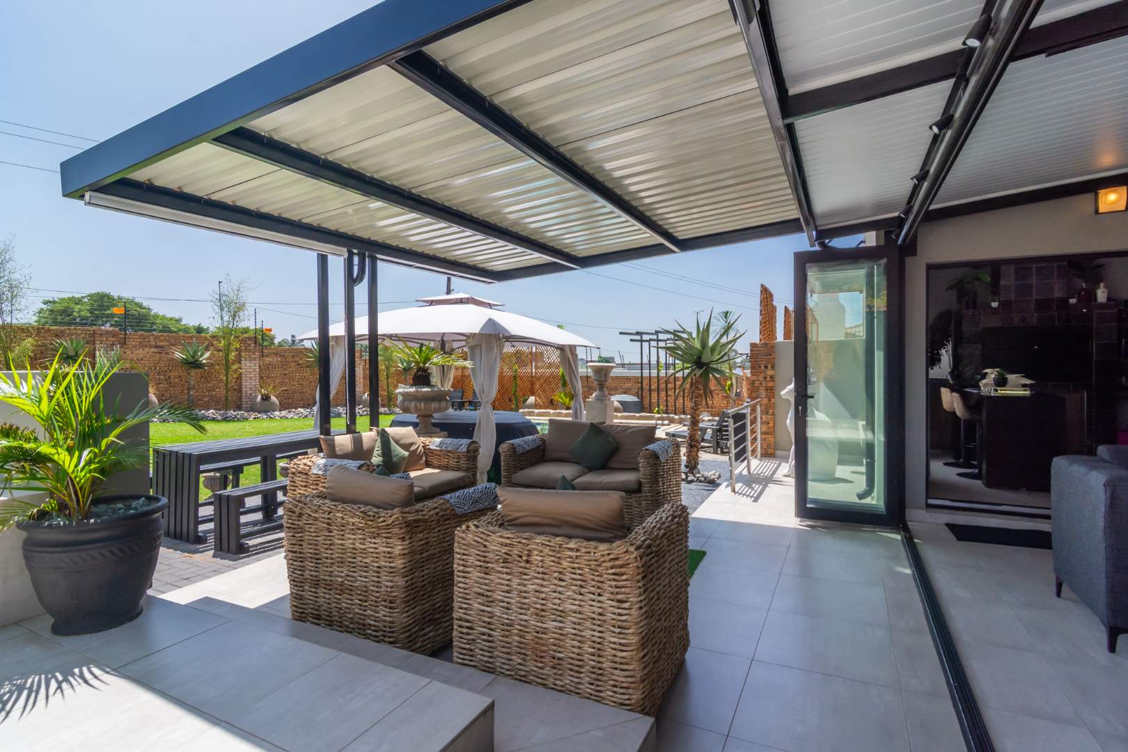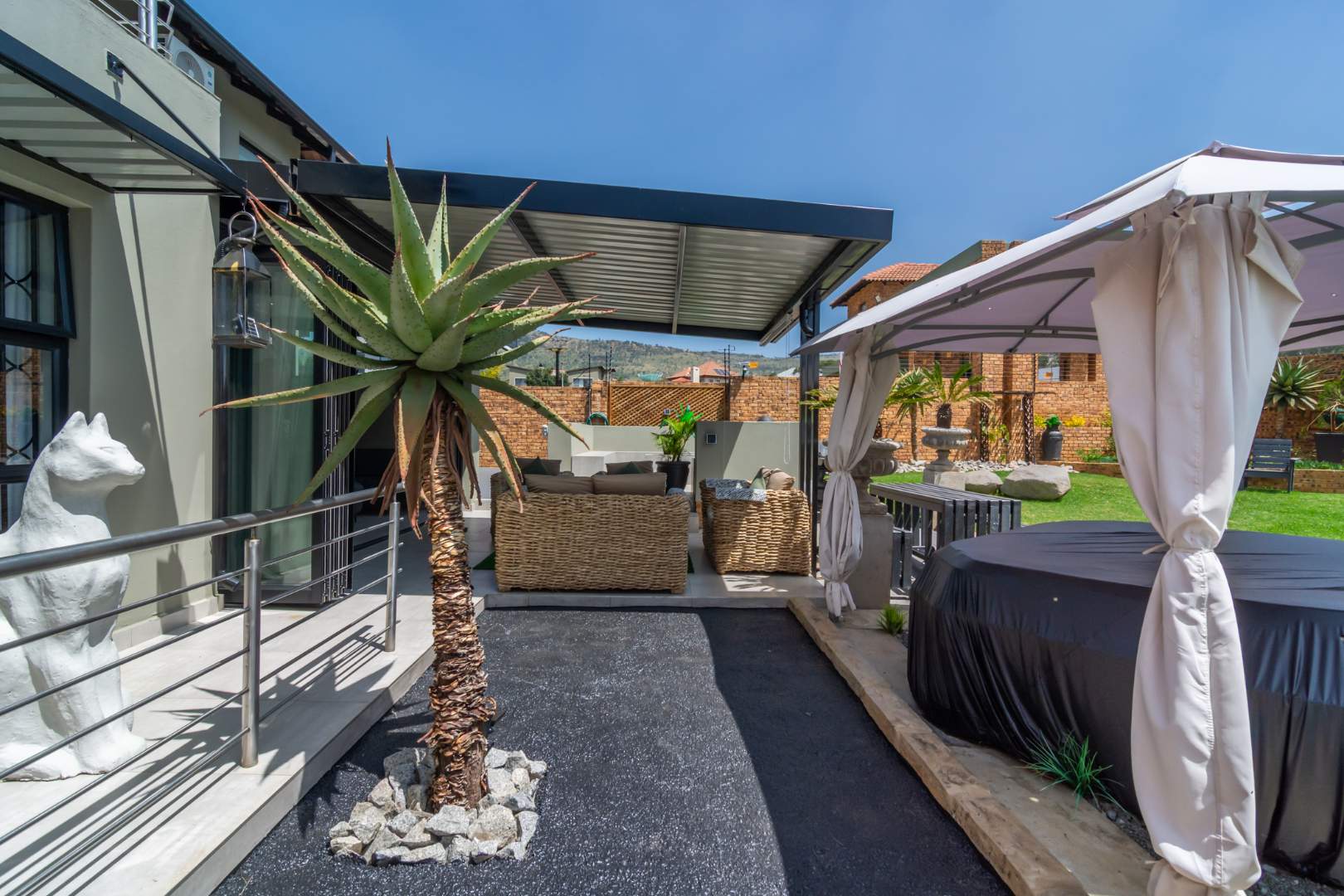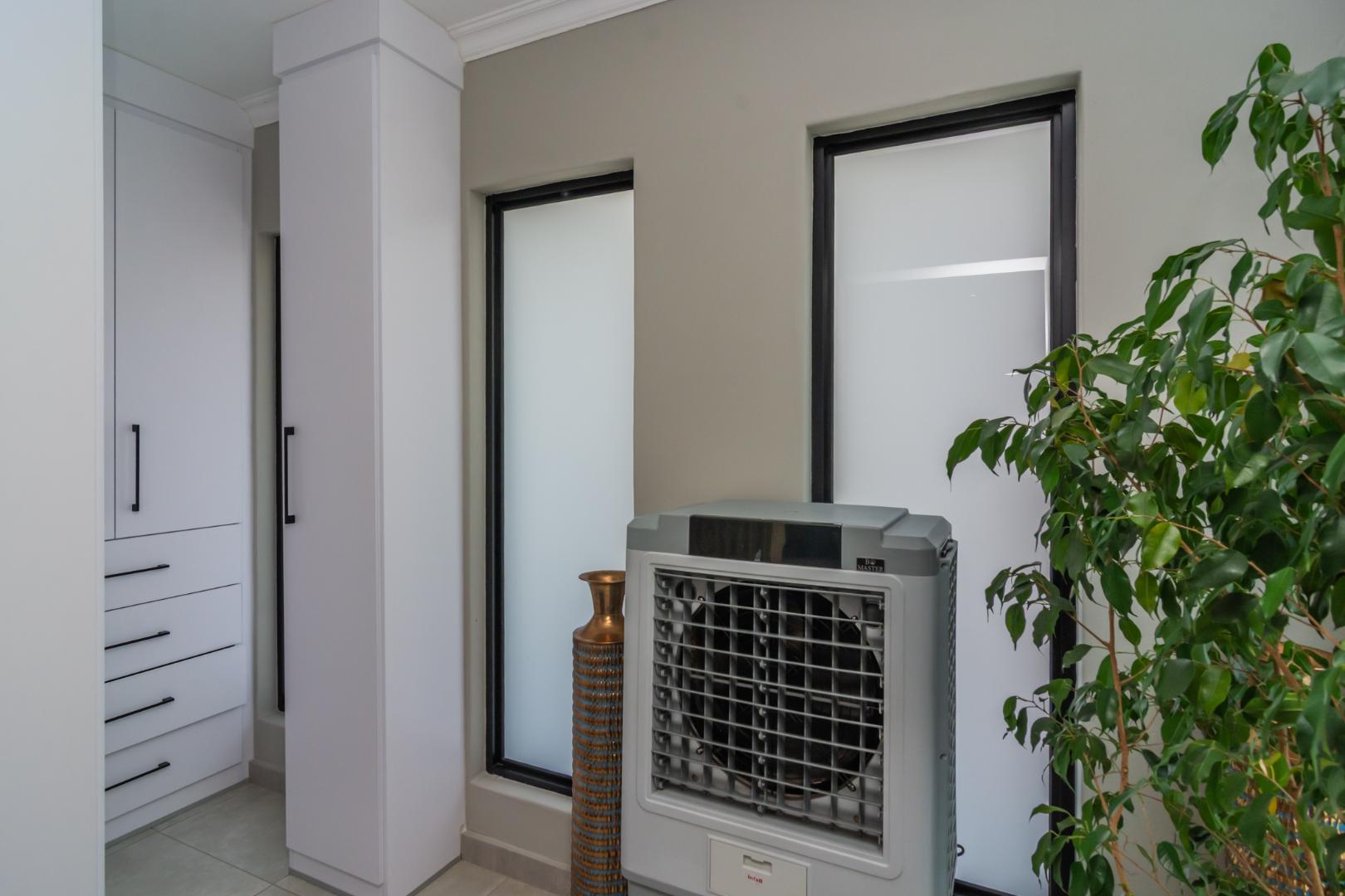 The outdoor double volume garden and space is equally impressive, featuring a sparkling swimming pool, jacuzzi and a beautiful boma area, ideal for relaxed evenings and entertaining under the stars.