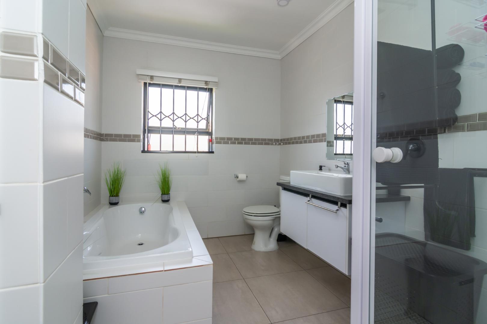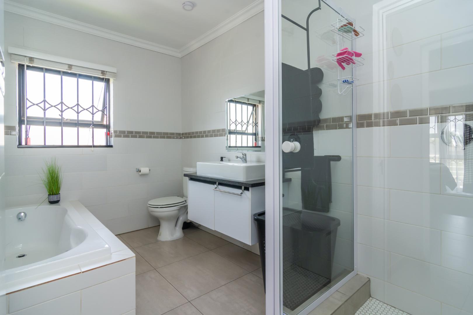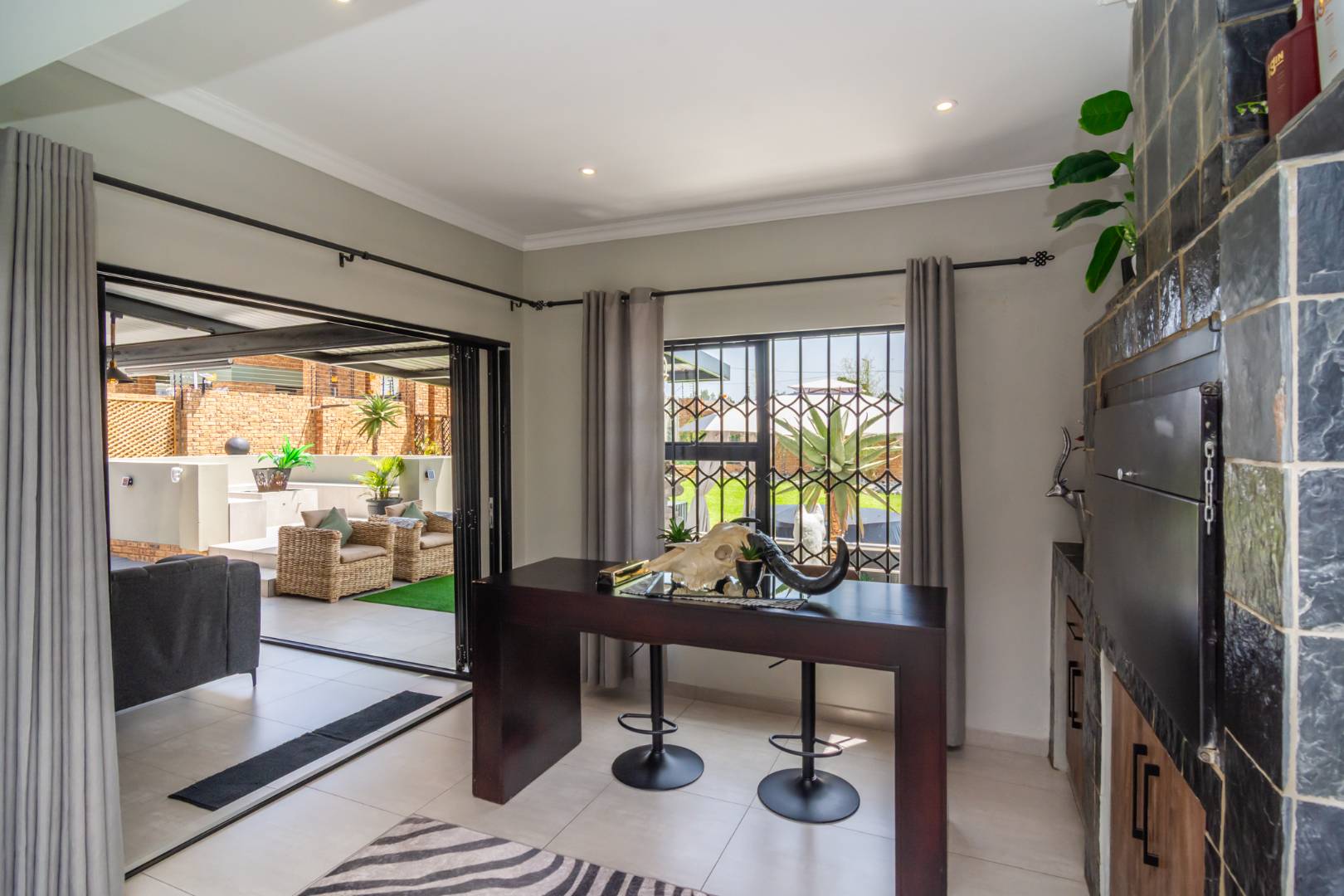Designed for effortless living, the home welcomes you with four expansive living areas, each offering its own unique atmosphere. The ground floor features a comfortable TV lounge, a refined dining room, a bright and inviting sunroom, and a built-in braai entertainment room — perfect for hosting family gatherings and entertaining guests throughout the year.