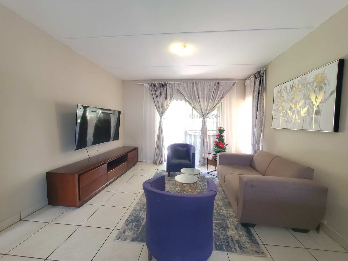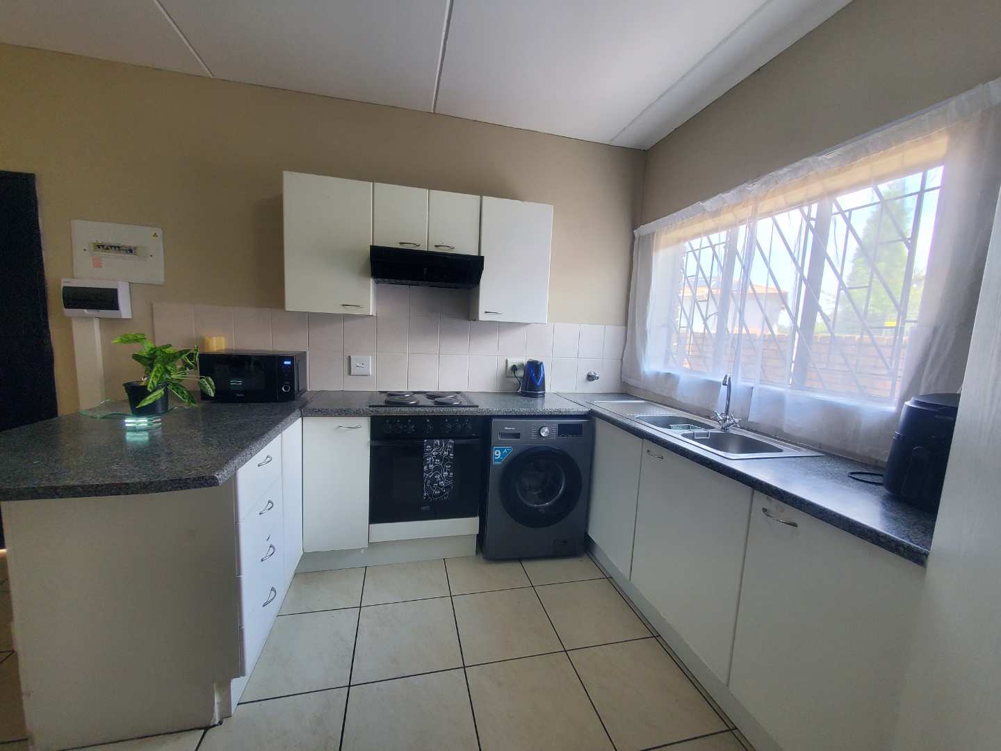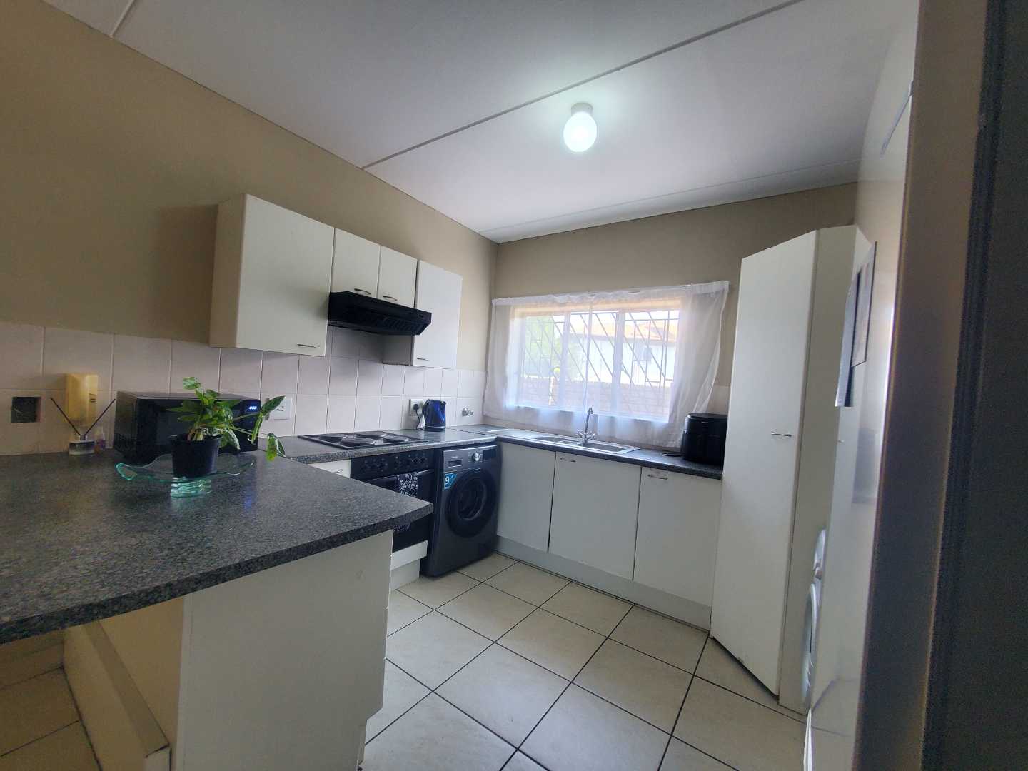 Step into the open-plan, spacious kitchen offering ample cupboard space and room for a double-door fridge. The kitchen flows seamlessly into a large lounge area, which opens - sliding doors onto a private patio overlooking a lush green garden — perfect for relaxing or entertaining.